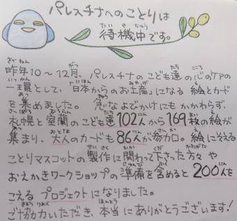 直近では、パレスチナのこども達の心のケアの一環として、「パレスチナへのことり」プロジェクトもありました。北海道パレスチナ医療奉仕団の後発隊メンバーに「日本からのお土産」を託そうと、2024年10月~12月の間に子どもが描いた絵とカードを集めたのです。しかし現地の状況が緊迫し渡航を断念。次の渡航がいつになるかはわかりませんが、集まった169枚の絵はそれまで大切に保管されるとのことです。日本のこども達の絵とことり達がパレスチナのこども達に届く日が早く来ますように。