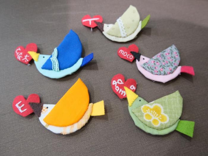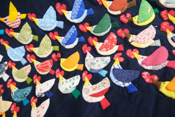 ひとつひとつ”はぎれ”を手で縫って作られた、ハートをくわえた小鳥たち。ハート部分には参加者の名前やイニシャルが刺繍されています。これをタペストリーに縫い付けていき、どんどん集まっていくと……