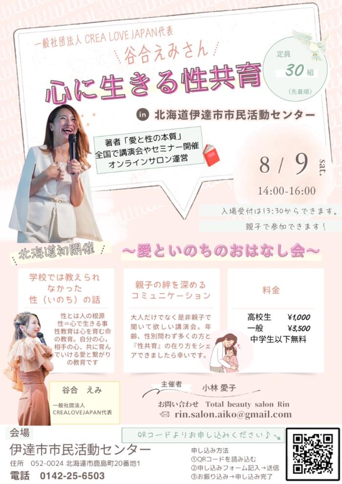 ゲスト講師の  谷合 えみ(たにあい えみ)さんは、19歳と17歳のお母さんでもあり、書籍『愛と性の本質』を出版され、全国で講演会やセミナーを多数開催されています。8月9日は、このおはなし会のために大阪から遥々伊達市にいらっしゃいます。なんと北海道での初開催が伊達市とのことです!